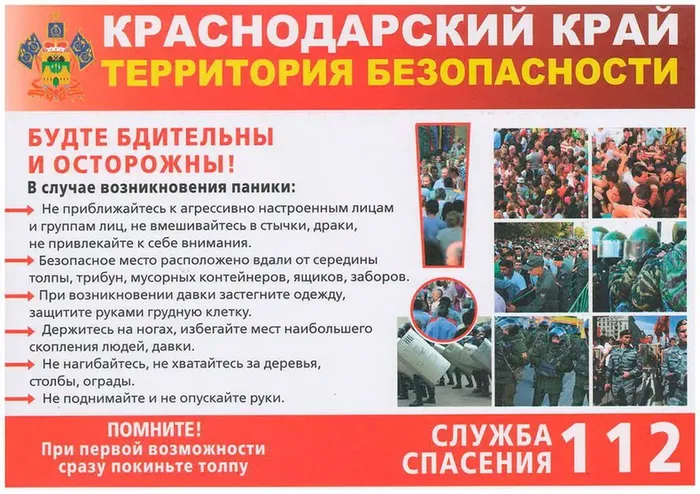 Как уцелеть в толпе? Лучшее правило — далеко её обойти!!! Если это невозможно, ни в коем случае не идти против толпы. Если толпа вас увлекла, старайтесь избежать и её центра, и края. Уклоняйтесь от всего неподвижного на пути, иначе вас могут просто раздавить. Не цепляйтесь ни за что руками, их могут сломать. Если есть возможность, застегнитесь. Высокие каблуки могут стоить вам жизни, как и развязанный шнурок. Выбросите сумку, зонтик и т.д.
