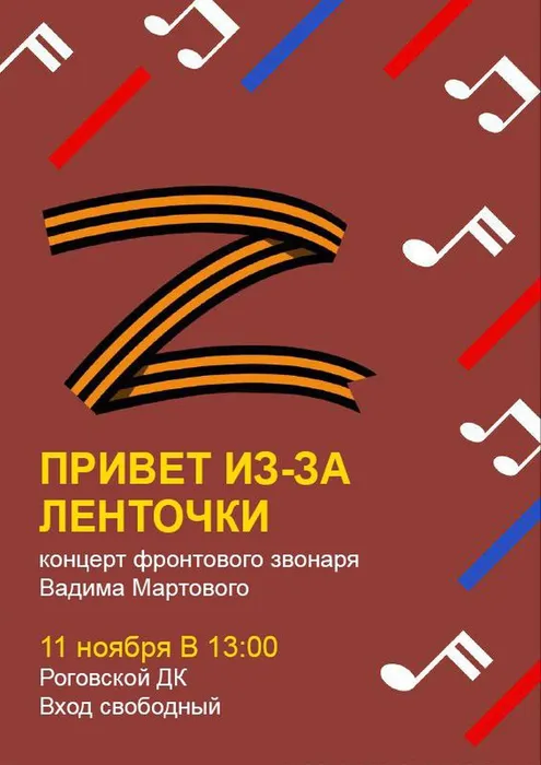 11 ноября в 13:00 в ДК ст. Роговской состоится концерт «Привет из-за ленточки» фронтового звонаря с позывным «Добрый» Вадима Мартового, республика Крым.