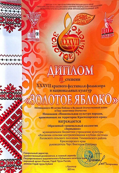 Участниками стали образцовый танцевальный коллектив «Зёрнышко», муниципальное бюджетное учреждение культуры «Роговская сельская централизованная клубная система» Роговского сельского поселения Тимашевского района Краснодарского края, руководитель Чаус Виктория Олеговна. Коллектив достойно представил свои хореографические номера: "Быт казачек", "Подружки" и по итогам был награждён дипломом 3 степени.