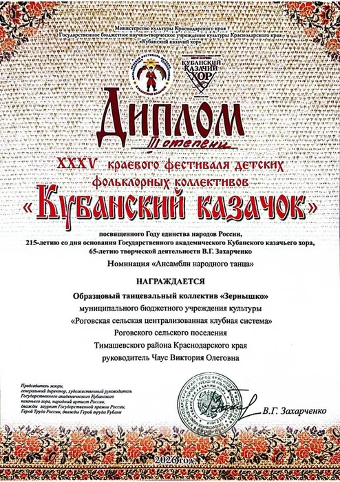 3 февраля в станице Елизаветинской прошёл зональный этап XXXV краевого фестиваля фольклорных коллективов «Кубанский казачок». Тимашевский район представил образцовый танцевальный коллектив «Зёрнышко» (руководитель Чаус Виктория Олеговна)