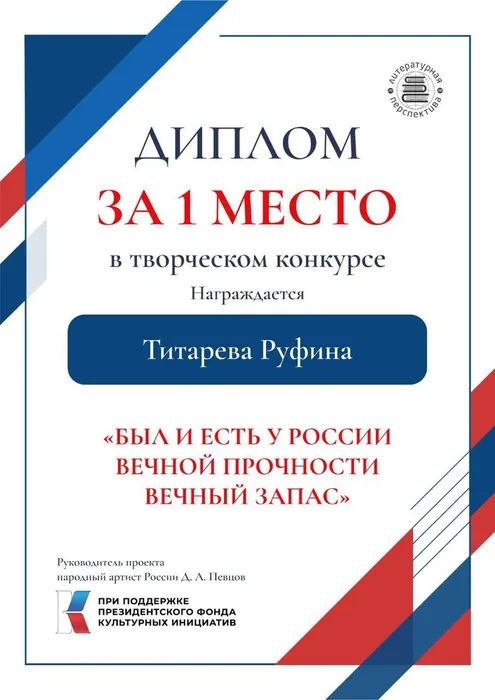 Юная талантливая участница ТЮЗ «Дебют» – Титарева Руфина завоевала первое место в творческом конкурсе АНО «Литературная перспектива» с глубоким названием «Был и есть у России вечной прочности вечный запас».