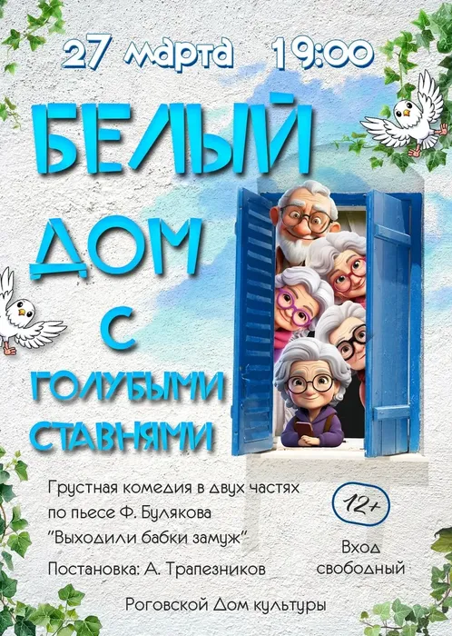 27 марта в Роговском Доме культуры в 19:00 состоится спектакль «Белый дом с голубыми ставнями», приуроченный Дню театра. Грустная комедия по пьесе Ф. Булякова «Выходили бабки замуж». Постановка А. Трапезников.