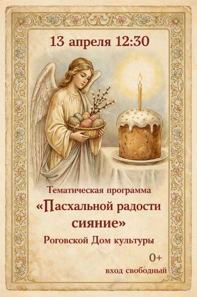 13 апреля в Роговском Доме культуры в 12:30 состоится тематическая программа «Пасхальной радости сияние», приуроченная празднованию Пасхи. В фойе представлена выставка ДПИ «Пасхальный перезвон».