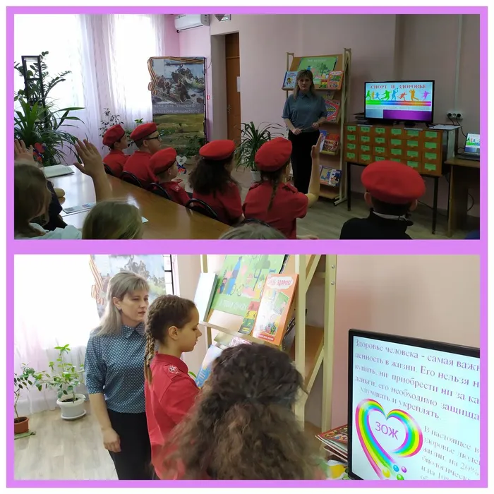 В завершение программы библиотекарь обратила внимание ребят на тематическую выставку «Твоё здоровье в твоих руках» и продемонстрировала ролик «О спорте».